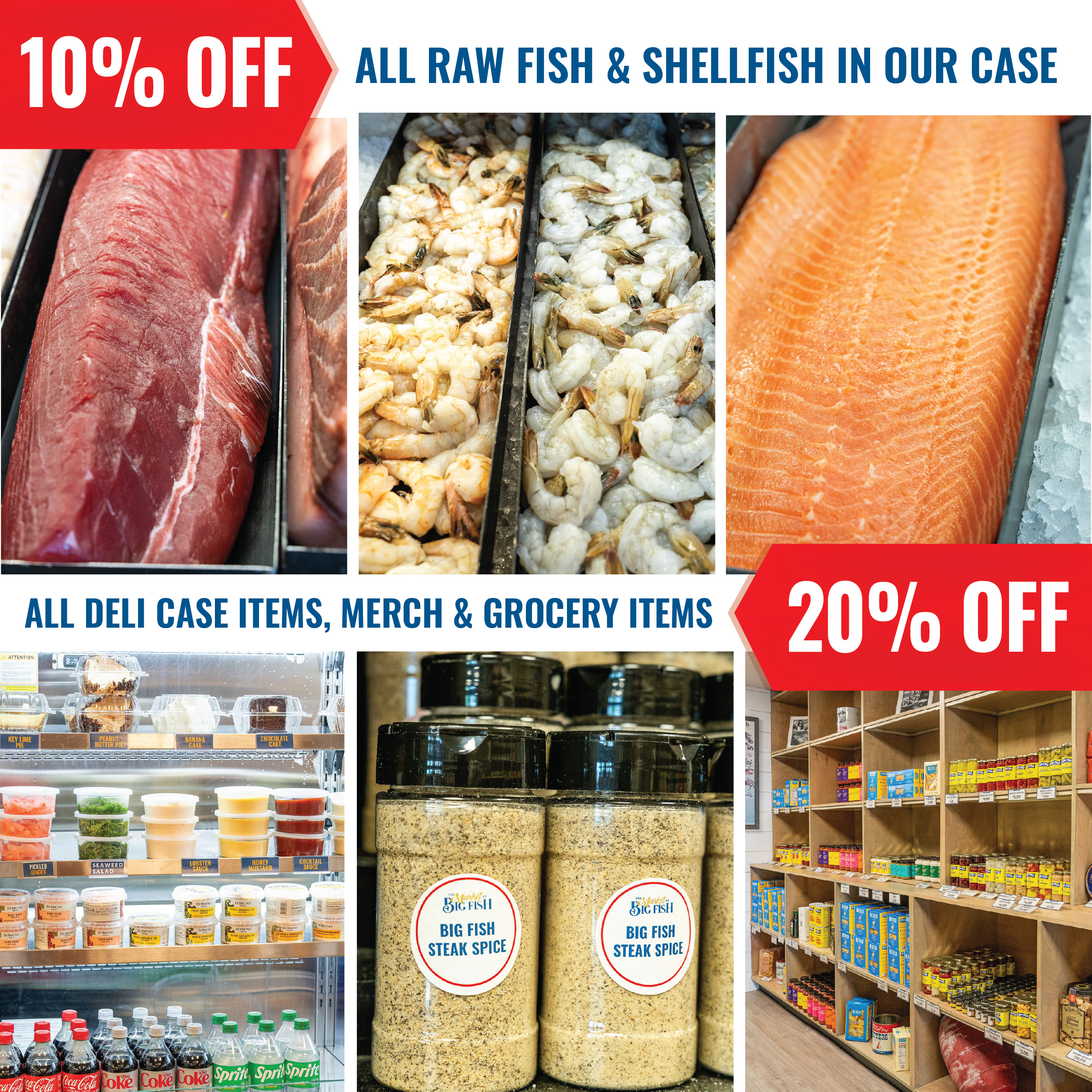 We are the area’s premier gourmet seafood market providing the freshest fish and shellfish and delicious Big Fish take-out! We are open every day serving lunch and dinner to-go!