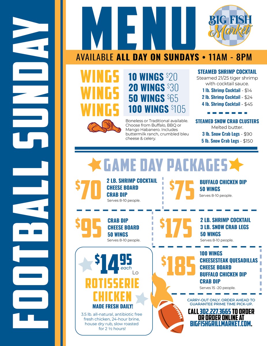 2026-01-18 11:00:002026-01-18 20:00:00America/New_YorkFootball Sunday Take-Out DealsAll Day Sunday! Wings, Shrimp, Rotisserie Chicken and more!Big Fish MarketBig Fish Marketmatt.seiler@atlasrestaurantgroup.com